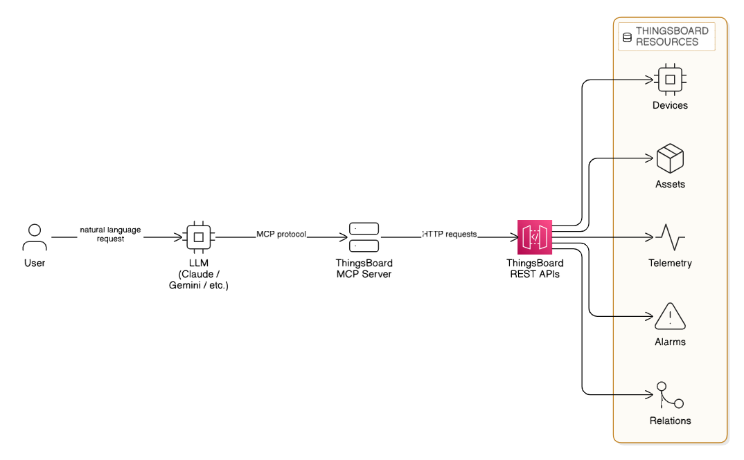 - Resource Retrieval: The system securely accesses specific ThingsBoard Resources including Devices, Assets, Telemetry, Alarms, and Entity Relations.